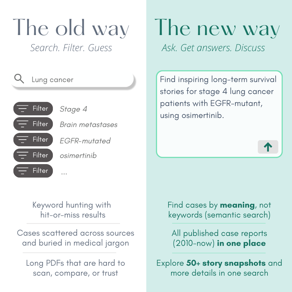 We help you find relevant survivor stories from 12,000+ case reports published by doctors around the world